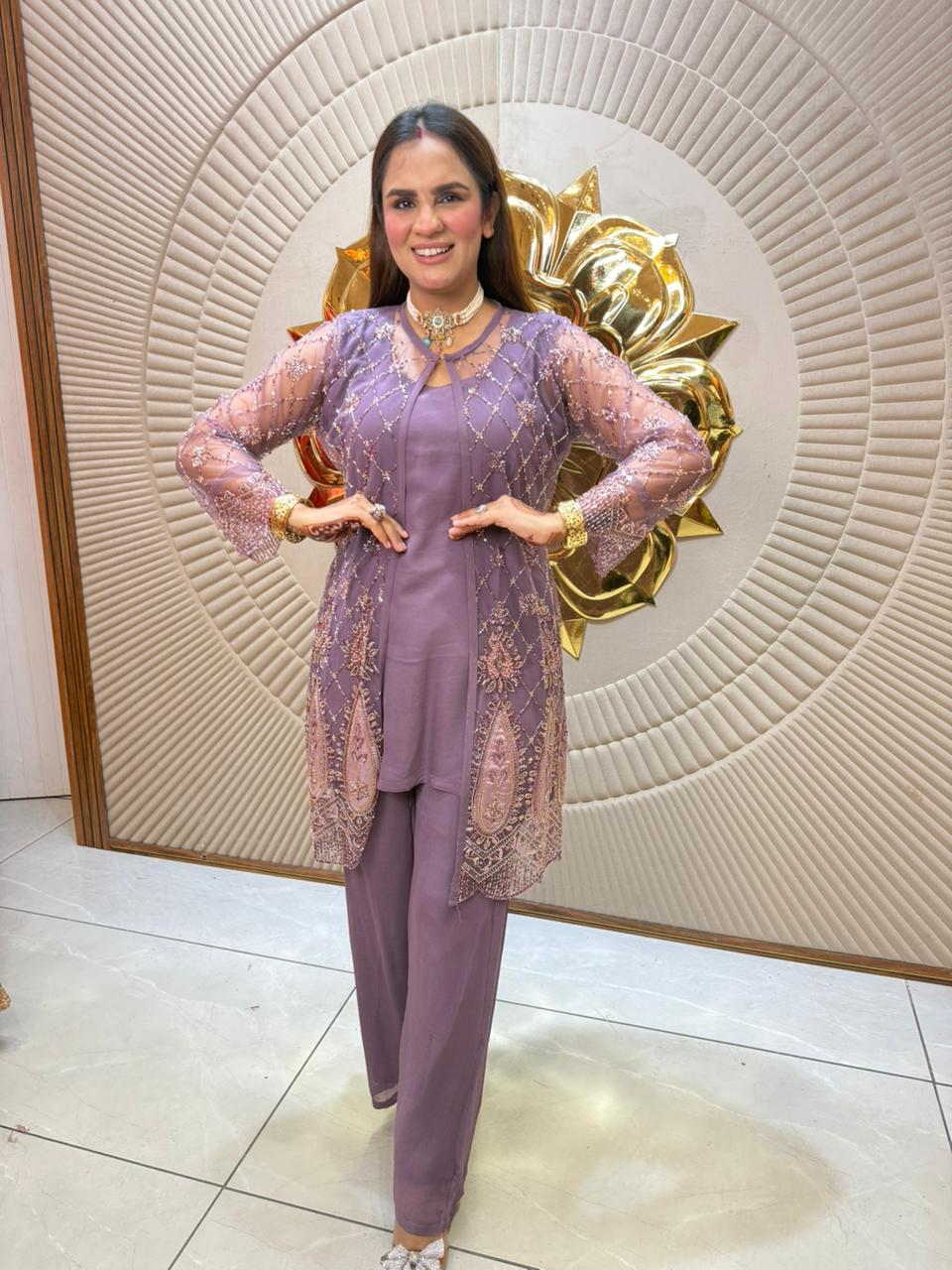 This elegant 3-piece set features a lightweight georgette shirt paired with matching bottoms, designed for comfort and style. The breathable fabric ensures all-day wearability while maintaining a graceful drape. Perfect for both casual and semi-formal occasions, this coordinated ensemble offers versatility and a polished look with minimal effort.