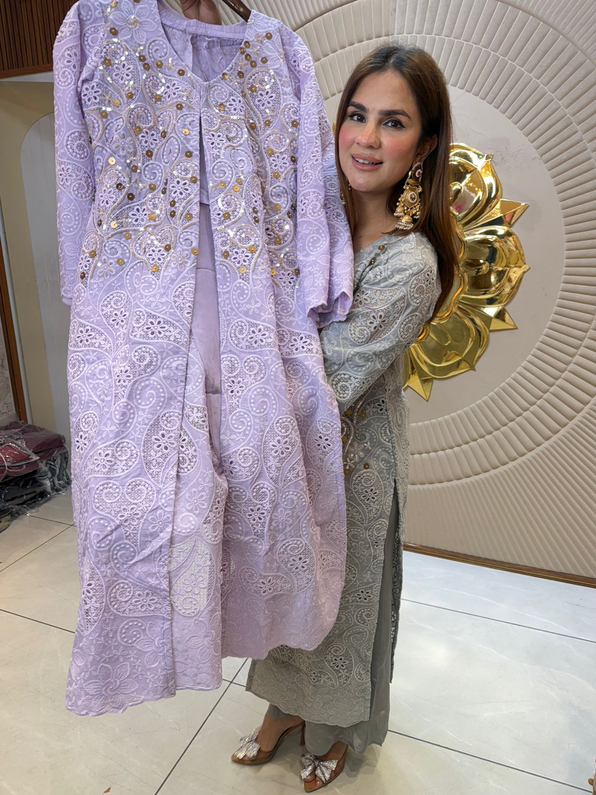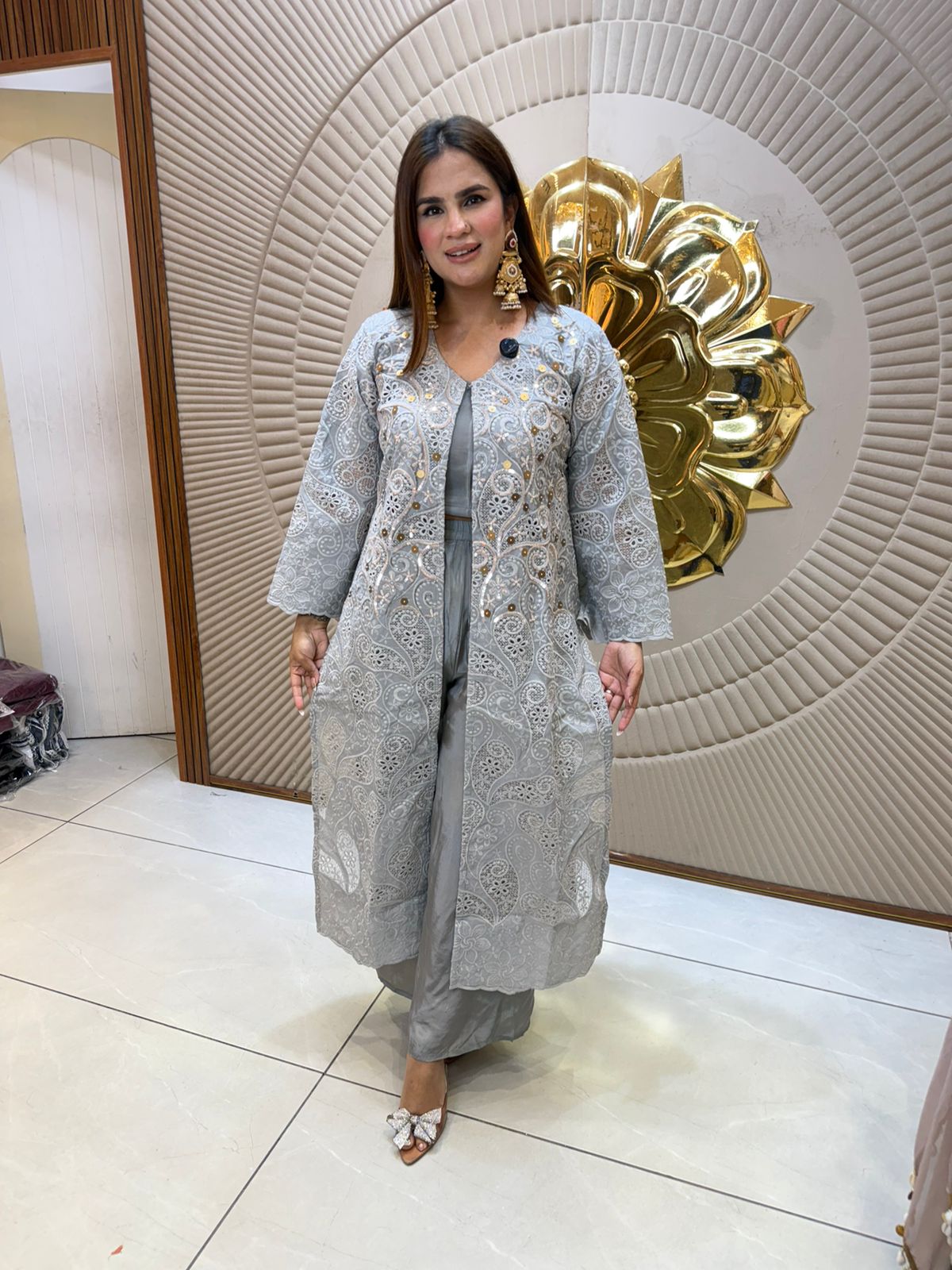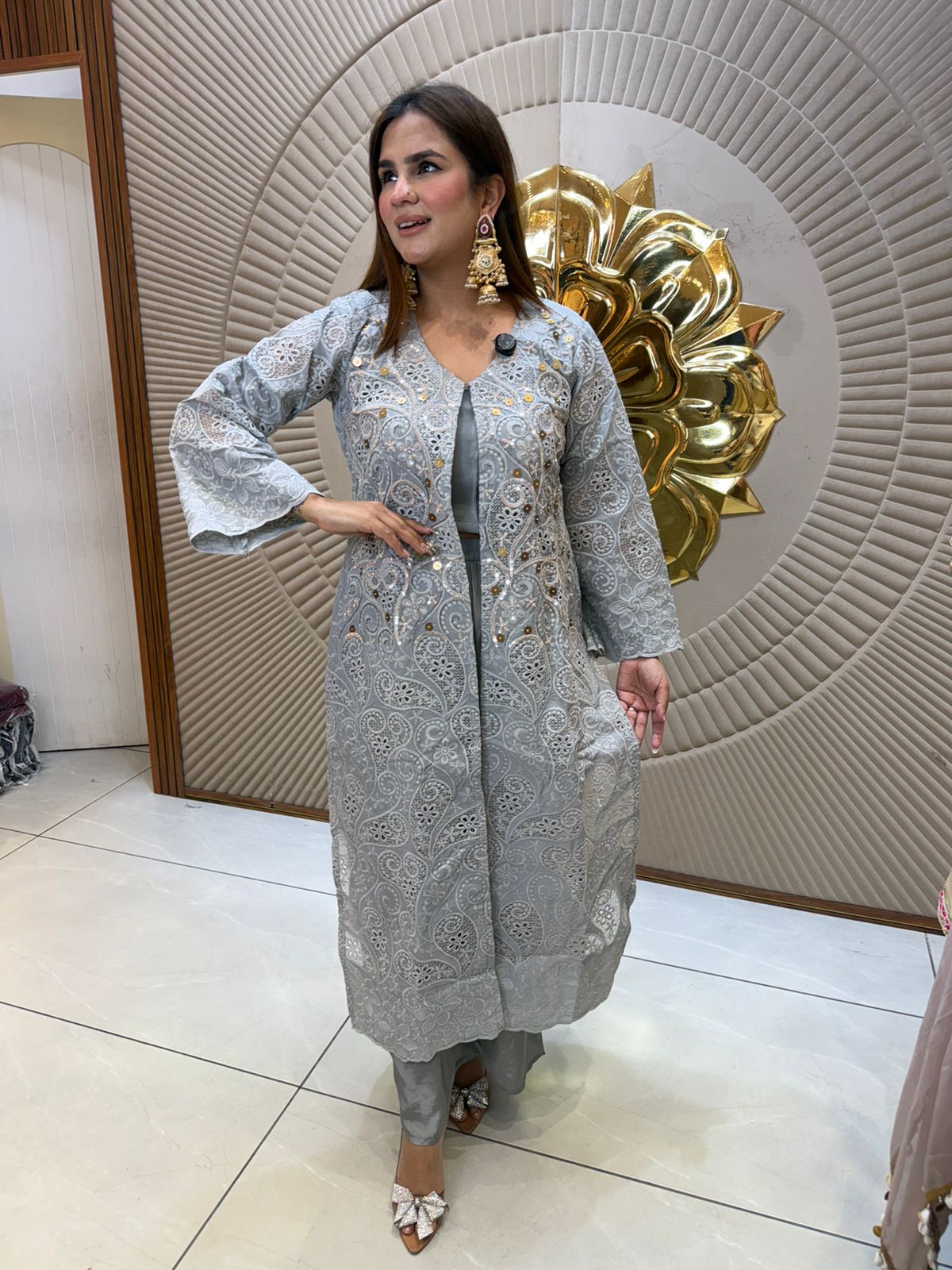 Elevate your ethnic wardrobe with this sophisticated 3-piece ensemble featuring a meticulously crafted long designer shrug. The set combines traditional elegance with contemporary styling, perfect for festive occasions, celebrations, or refined everyday wear. The extended shrug drapes gracefully, offering versatile layering options while maintaining a polished silhouette. Thoughtfully designed with attention to detail, this collection piece delivers premium aesthetics and comfortable wearability. Ideal for those who appreciate quality craftsmanship and timeless fashion sensibility.