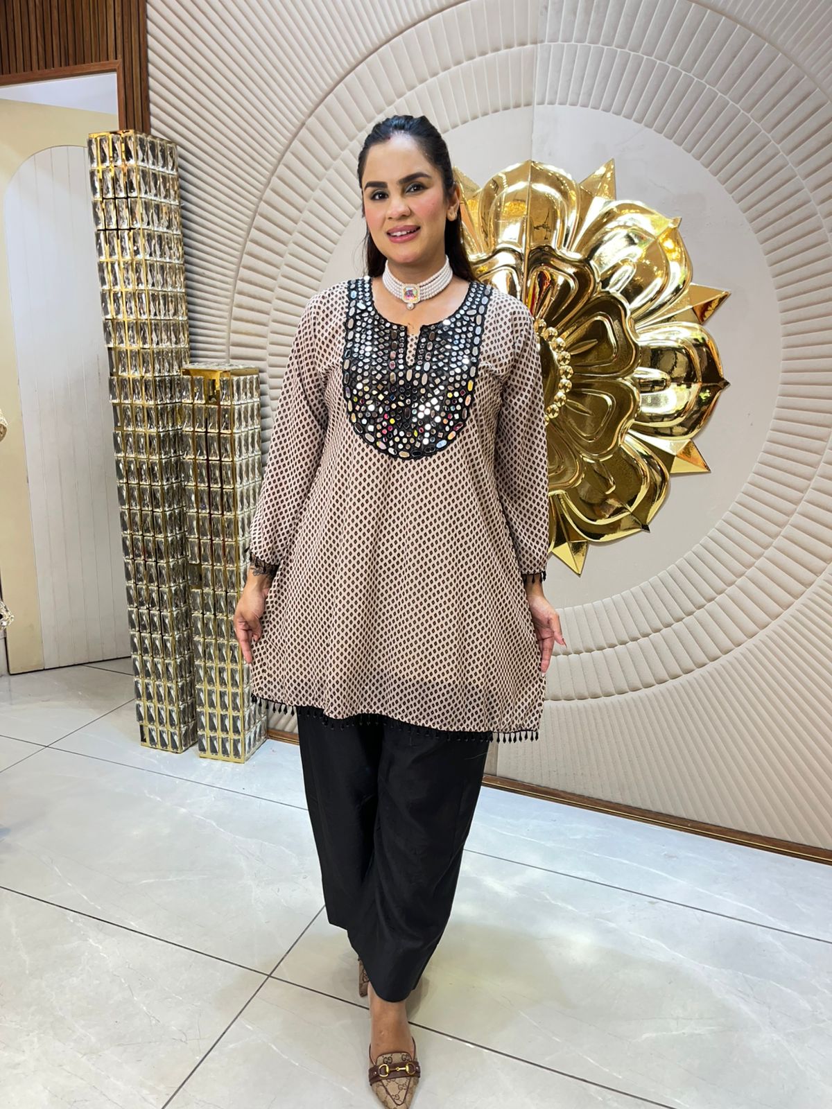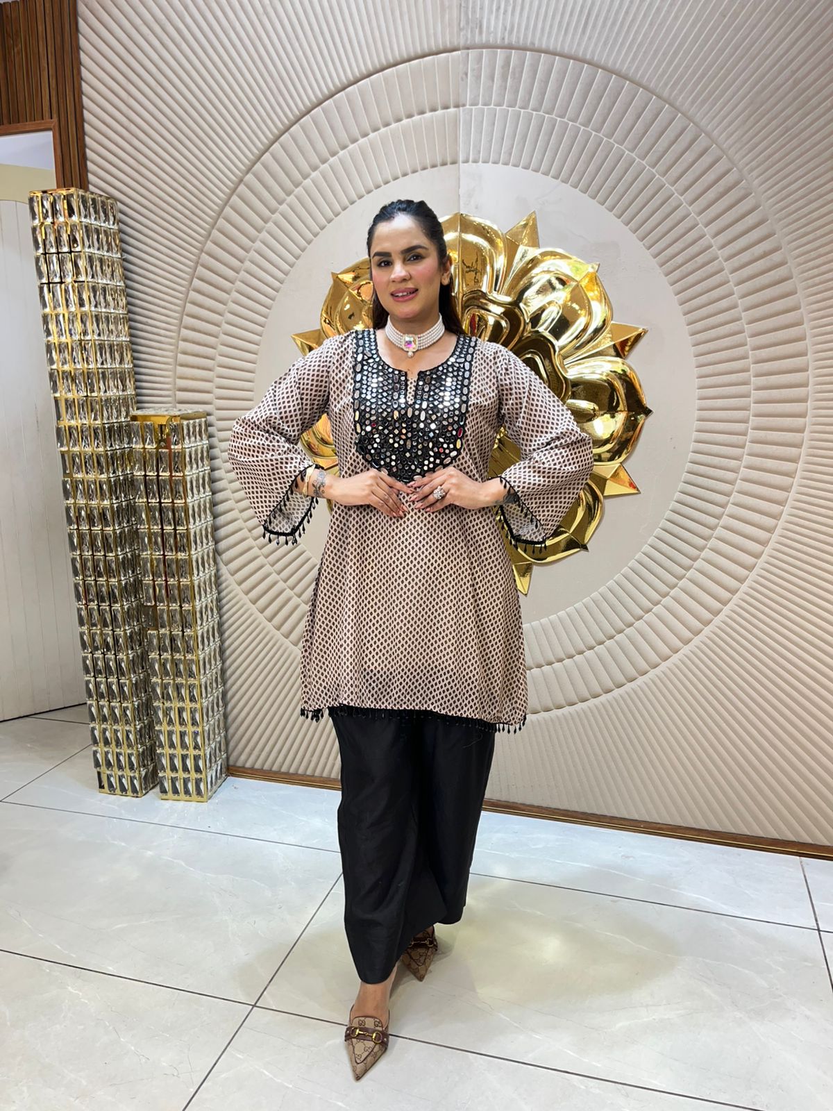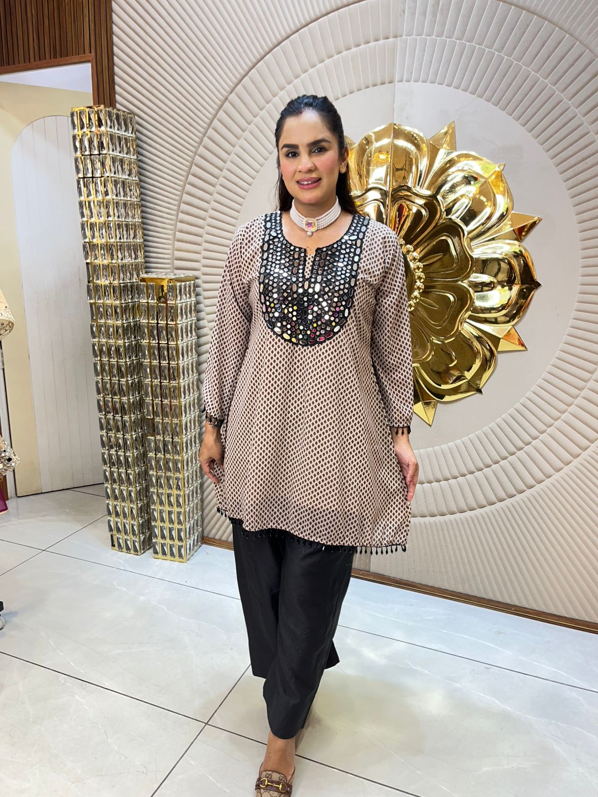 This elegant co-ord set features intricate mirror work that adds a refined sparkle to the ensemble. Designed for versatile styling, it offers both comfort and sophistication, making it ideal for festive occasions or casual gatherings. Crafted with attention to detail, this set ensures you stand out with understated charm.