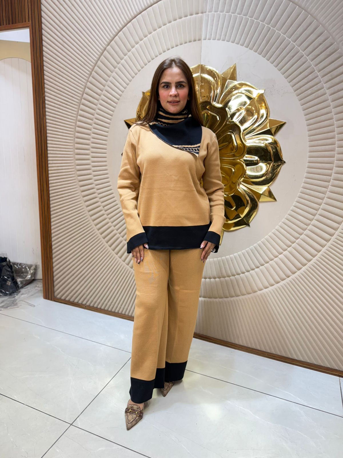 Elevate your wardrobe with this sophisticated co-ord set, expertly designed to deliver versatile styling options. The matching top and bottom create a cohesive silhouette, while the included scarf adds dimension and refinement to your ensemble. Perfect for both casual outings and semi-formal occasions, this set showcases thoughtful construction and quality fabric that ensures comfort throughout the day. The coordinated pieces work seamlessly together or can be mixed with your existing pieces for extended styling possibilities. An essential addition for those who appreciate curated, polished looks.