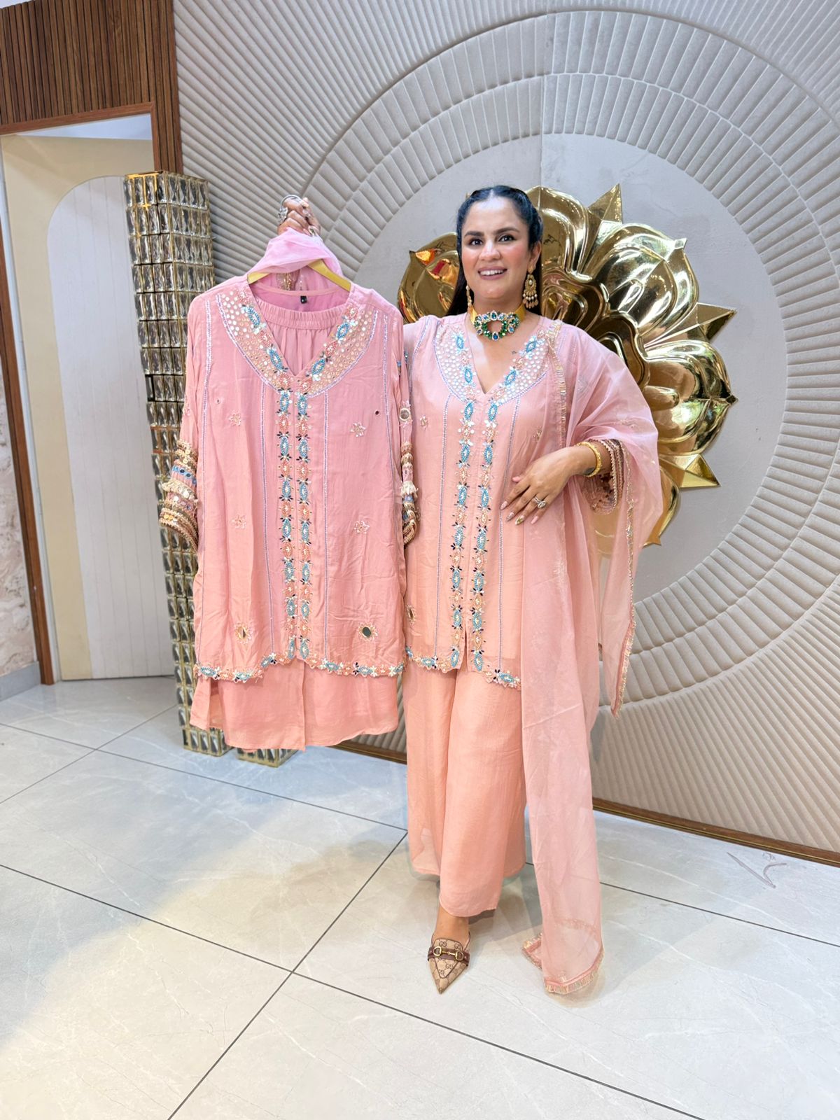 This Beautiful Designer Suit with Lace Work on Sleeves PC1783 showcases exquisite craftsmanship with delicate lace detailing that adds a touch of elegance to the traditional design. The suit is tailored to provide a flattering fit, combining style and comfort seamlessly. Ideal for special occasions, it elevates your ensemble with refined textures and sophisticated appeal.