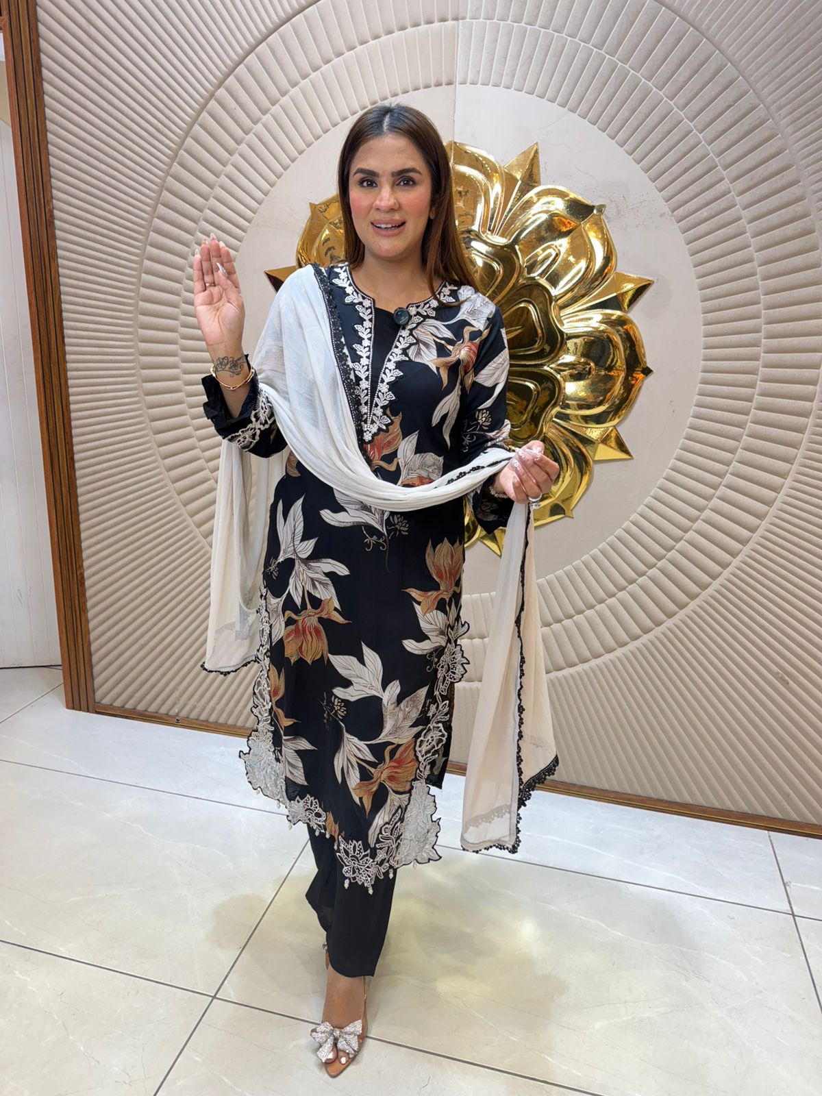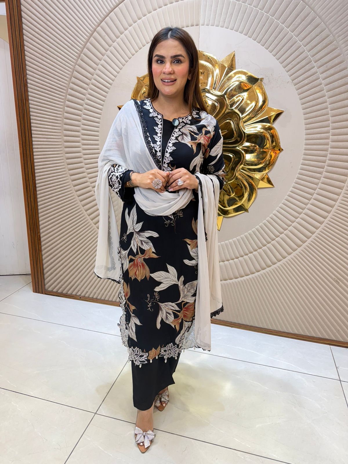 Elevate your wardrobe with this exquisite suit featuring intricate mirror work embellishments. The shimmering mirrors are meticulously placed to create a sophisticated, eye-catching design that catches light beautifully. Crafted with precision tailoring, this piece combines traditional artistry with contemporary elegance, making it ideal for weddings, celebrations, and special occasions. The mirror detailing adds dimension and glamour while maintaining refined aesthetics. Perfect for those who appreciate detailed craftsmanship and timeless style.