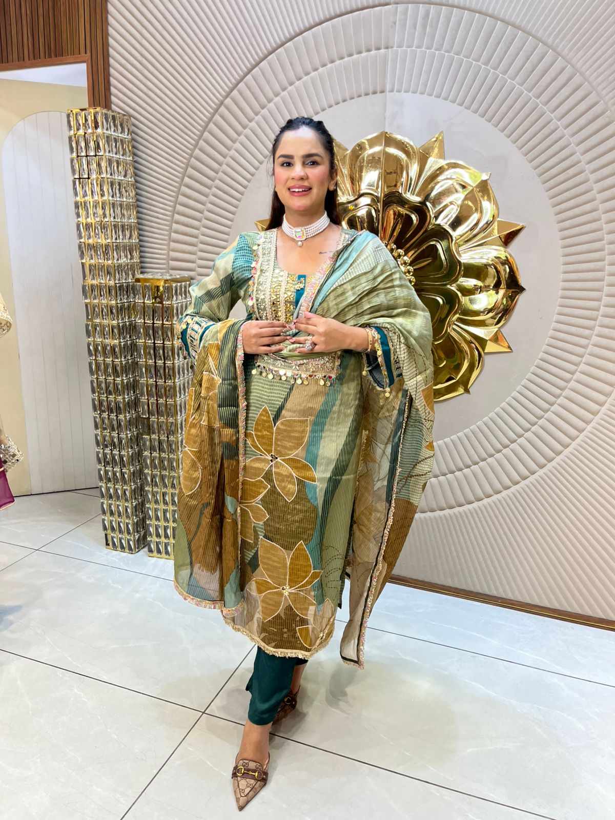 Elevate your wardrobe with this Beautiful Flower Print Suit featuring exquisite mirror work. Crafted with intricate details, the floral design combined with delicate mirror embellishments adds a sophisticated touch to traditional attire. Perfect for festive occasions or formal events, this suit offers both style and elegance while showcasing skilled craftsmanship.