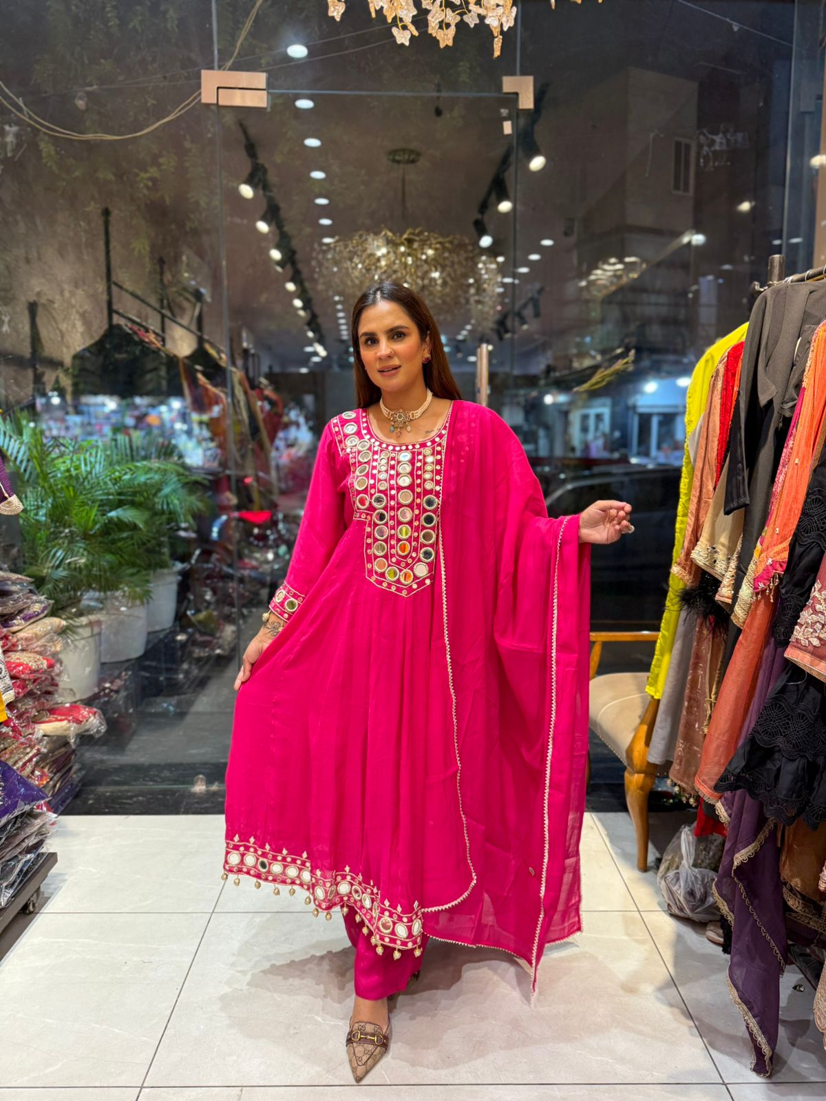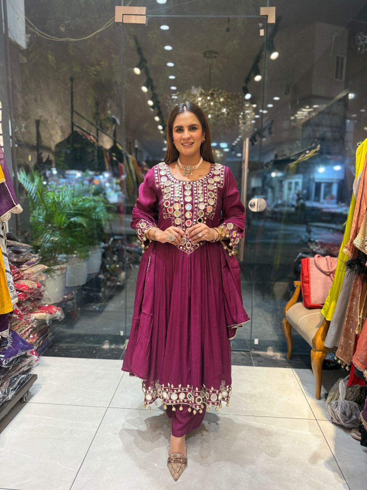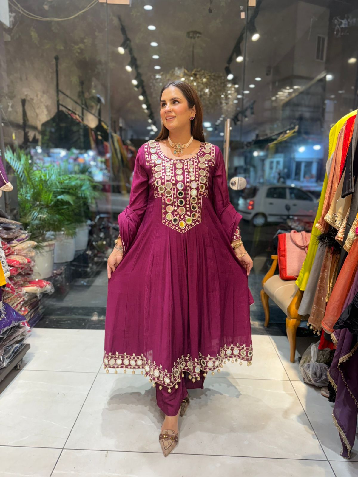 This beautiful suit features intricate front mirror work that adds a touch of elegance and traditional craftsmanship. Designed to enhance your style for festive occasions or special events, it offers a perfect blend of classic charm and contemporary appeal. The detailed mirror embellishments reflect light subtly, making the suit stand out while maintaining sophistication. Ideal for those who appreciate artisanal detailing in their wardrobe.