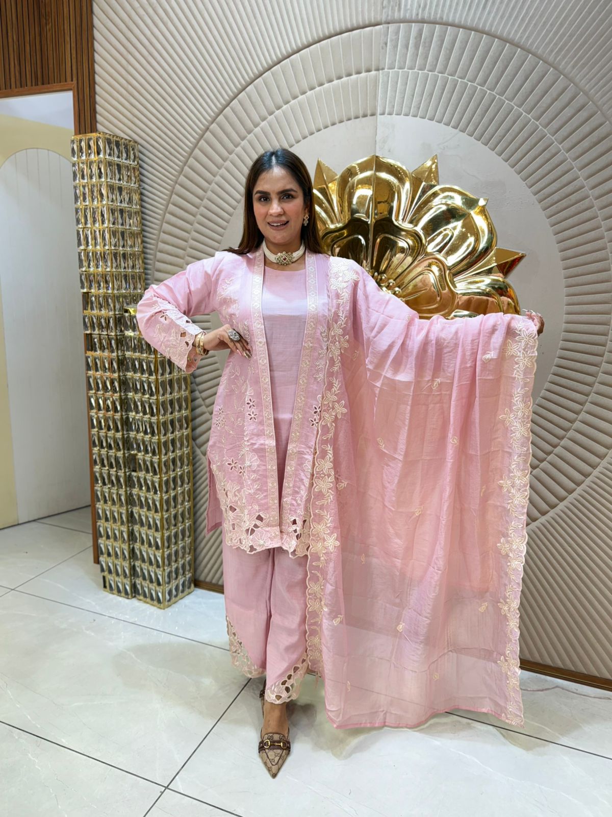 This elegant suit features intricate laser-cut detailing that adds a sophisticated texture to the fabric, enhancing its visual appeal without compromising comfort. Designed for those who appreciate refined craftsmanship, it offers a flattering fit and easy wearability, making it an ideal choice for both formal and festive occasions. The precise laser-cut work showcases advanced techniques that ensure durability alongside aesthetic appeal. Elevate your wardrobe with this expertly crafted piece that combines style and subtle elegance effortlessly.