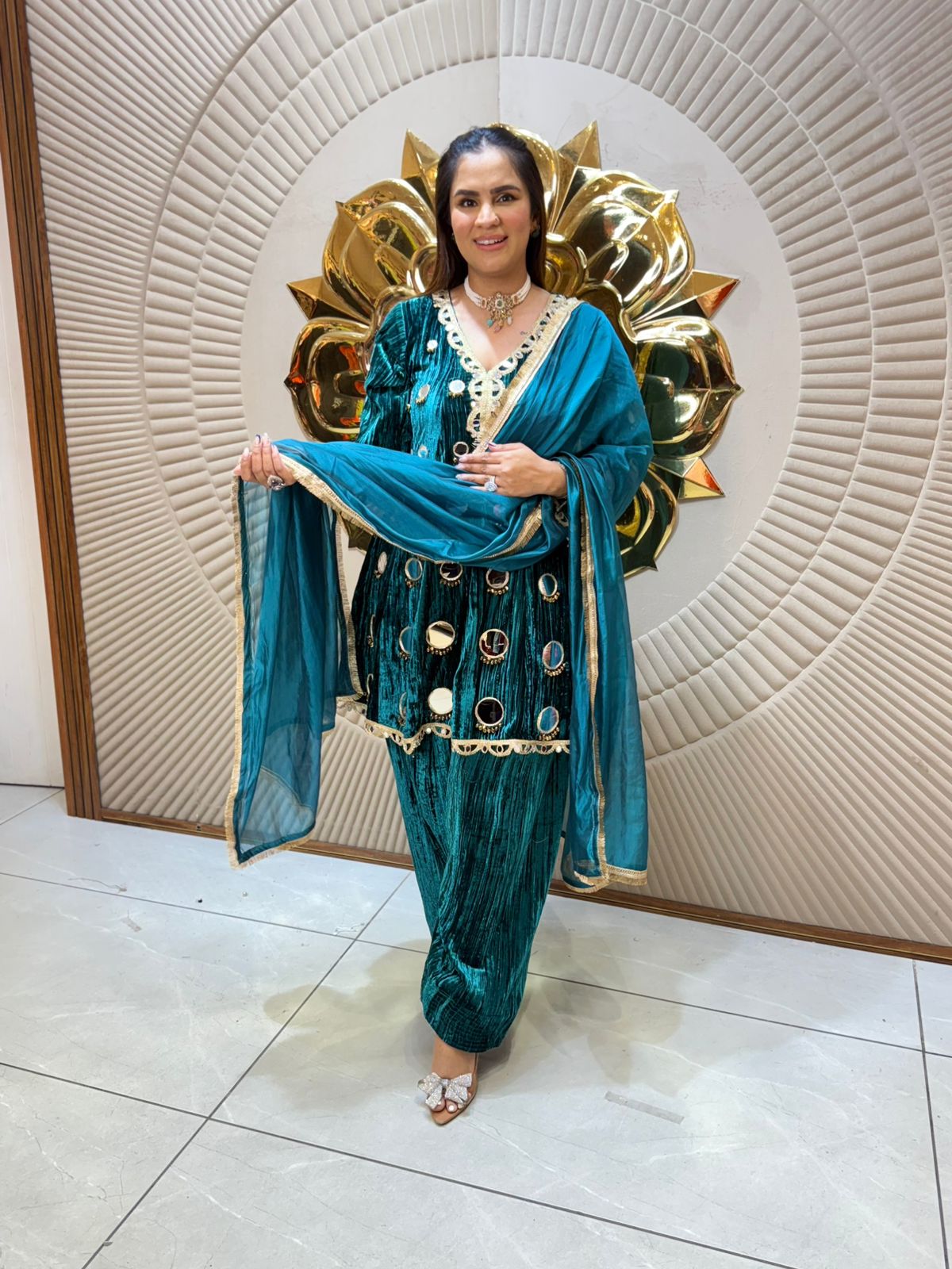 Elevate your wardrobe with this exquisite velvet suit, a masterpiece of refined craftsmanship. The luxurious velvet fabric drapes beautifully, offering a soft, sophisticated texture that catches light elegantly. Intricate mirror work adorns the design, creating a stunning visual impact perfect for weddings, celebrations, and special occasions. The expert tailoring ensures a flattering silhouette, while the ornamental detailing adds an unmistakable touch of glamour. Ideal for those who appreciate traditional artistry combined with contemporary style.