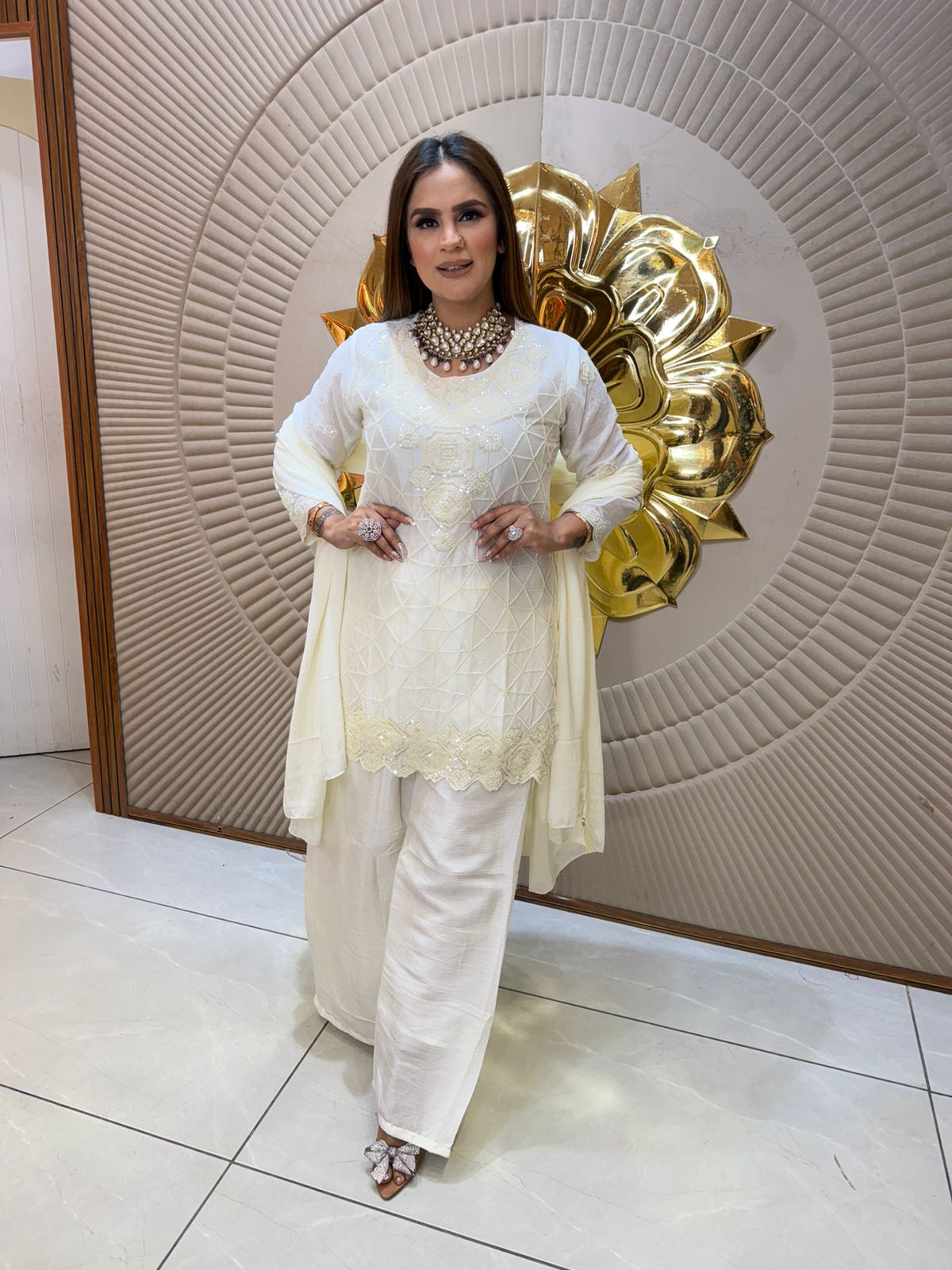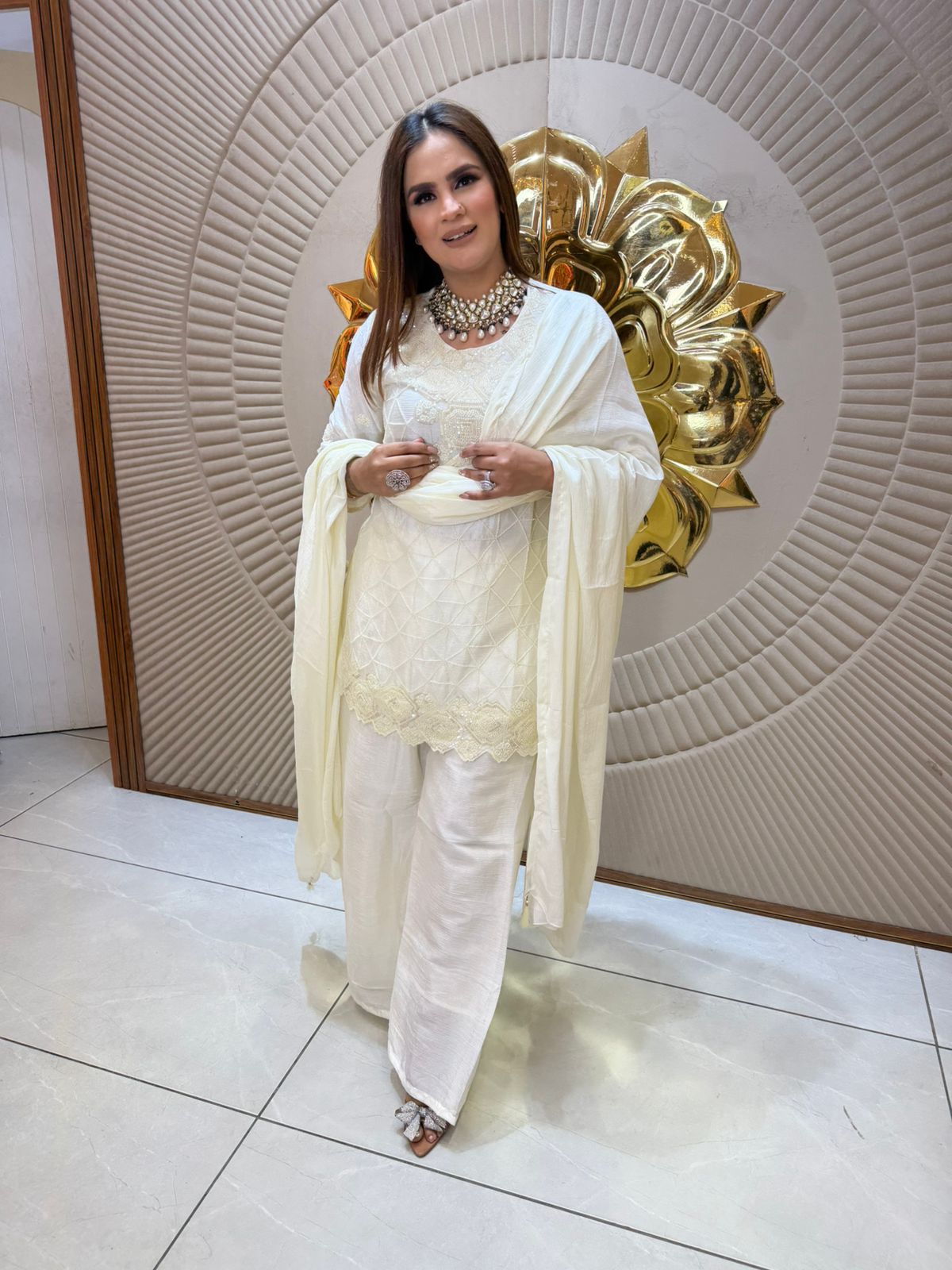 Elevate your wardrobe with this stunning elegant suit featuring intricate lace work detailing. The PC2810 combines traditional craftsmanship with contemporary style, perfect for special occasions, celebrations, or making a sophisticated statement. The delicate lace embellishments add a touch of refinement and grace to the tailored silhouette. Ideal for those who appreciate fine craftsmanship and timeless elegance. A versatile piece that transitions beautifully from festive gatherings to formal events.