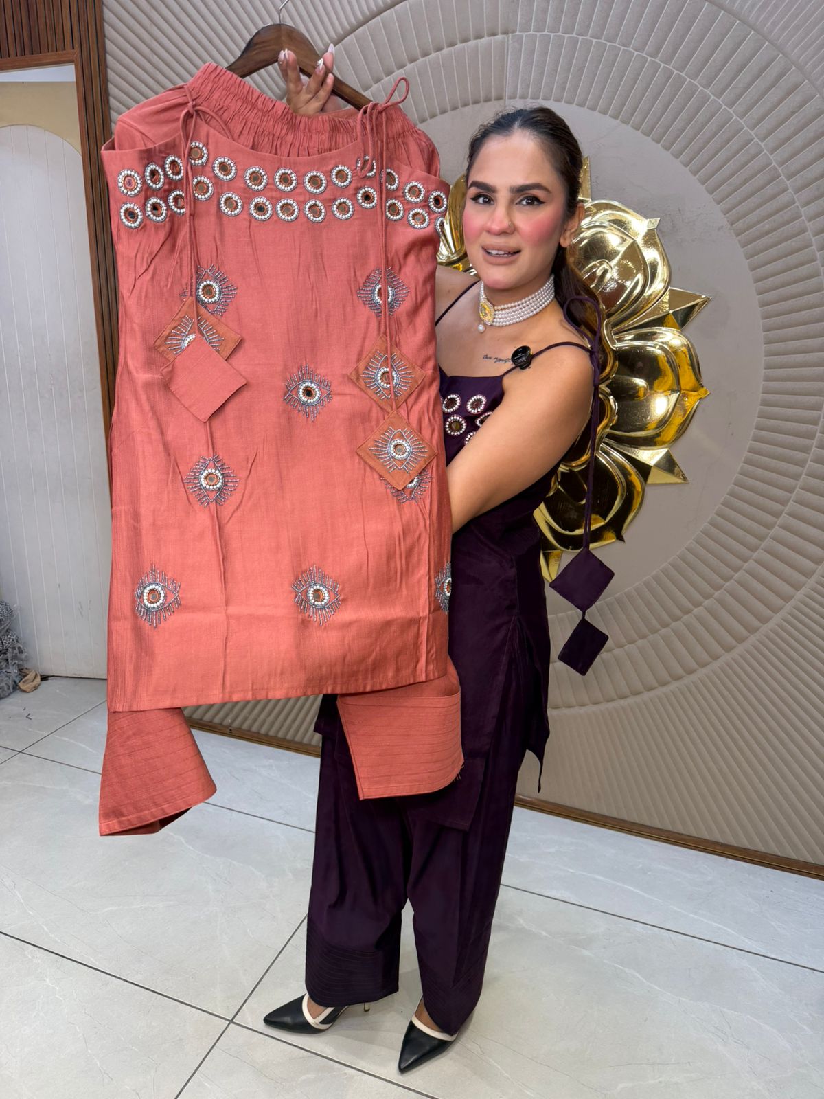 Elevate your wardrobe with this exquisite suit featuring intricate mirror work embellishments. The carefully placed mirrors catch light beautifully, creating a stunning visual effect that commands attention at any occasion. Crafted with precision tailoring, this piece combines traditional artistry with contemporary elegance. Perfect for weddings, celebrations, or upscale events, the mirror detailing adds a luxurious dimension to your ensemble. The expert craftsmanship ensures both comfort and sophistication, making this suit an investment in timeless style.