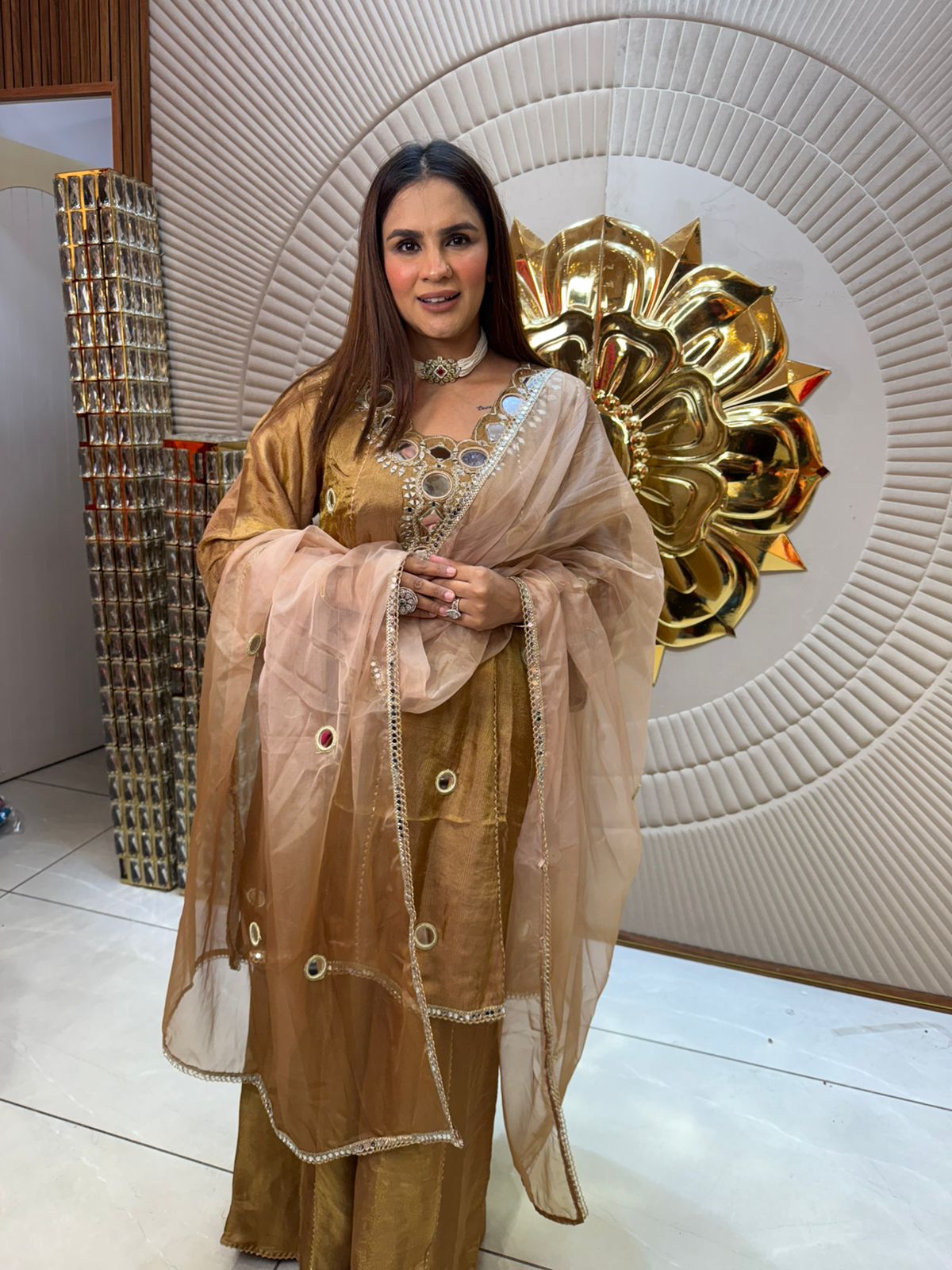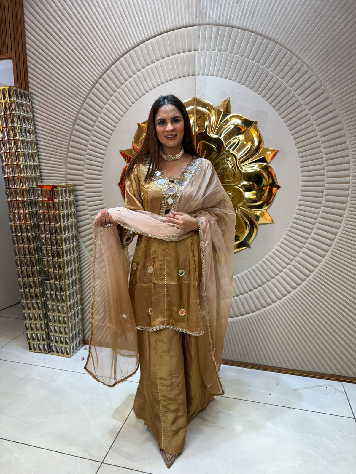 This Pure Crape Silk Suit features exquisite mirror work detailing on the neckline, enhancing its elegant design. Crafted from high-quality crape silk, the fabric offers a smooth texture and graceful drape, ensuring comfort and a refined appearance. Ideal for festive occasions and formal events, this suit combines traditional craftsmanship with contemporary style for a distinguished look.