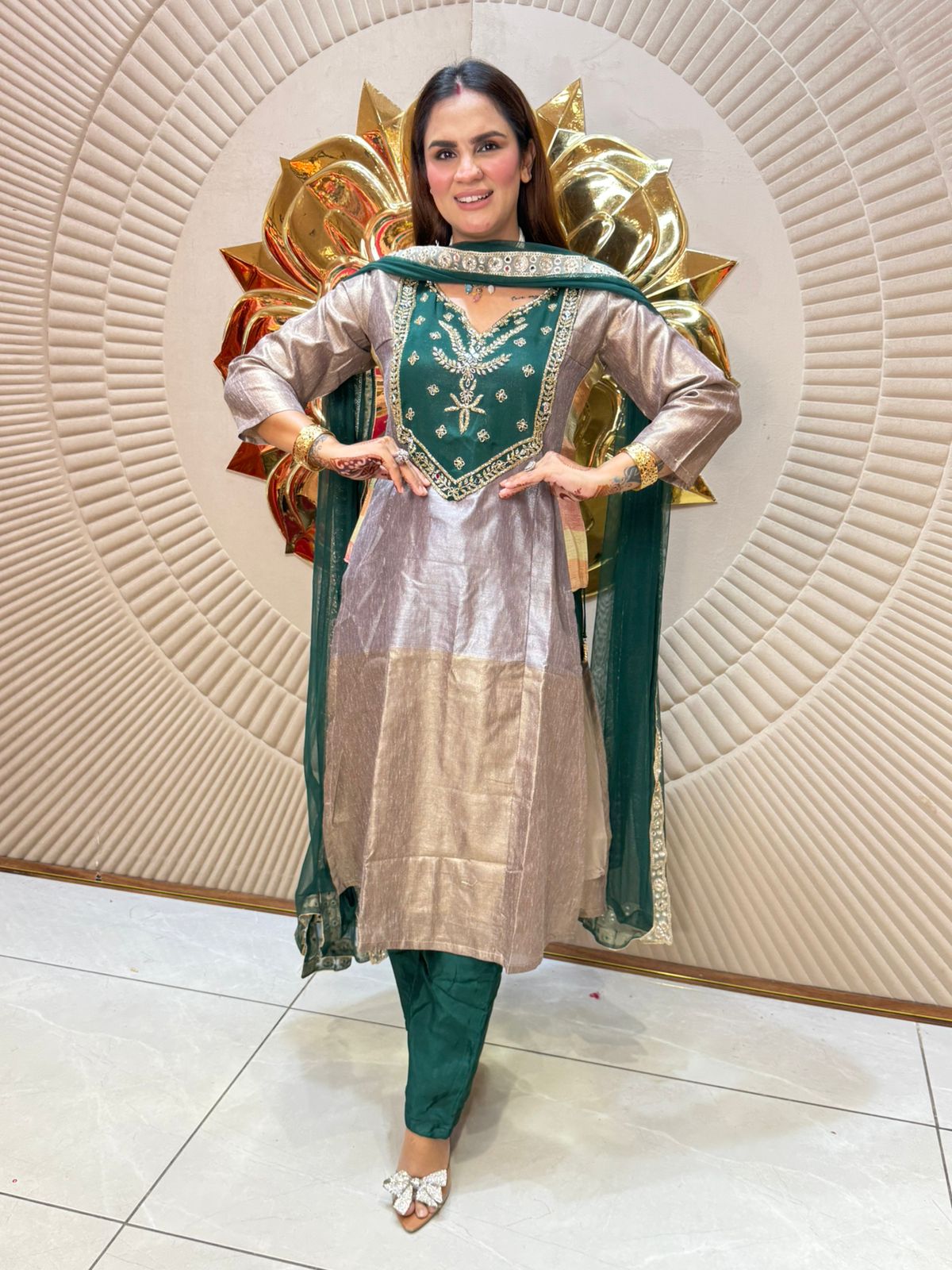Experience the elegance of this Pure Silk Suit with Full Embroidery Work, meticulously crafted to highlight intricate designs. The premium silk fabric ensures a luxurious feel and graceful drape, while the detailed embroidery adds a sophisticated touch, perfect for formal occasions and celebrations. This suit blends traditional craftsmanship with refined style, offering both comfort and a distinguished appearance that stands out with every wear.