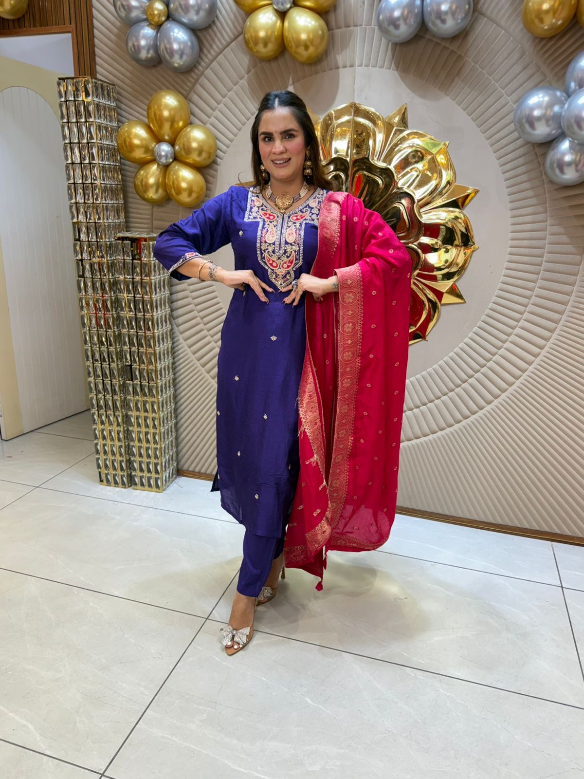 This Purple Embroidered Suit paired with a Pink Dupatta blends traditional craftsmanship with elegant design. The intricate embroidery on the suit enhances its rich purple fabric, creating a refined look suitable for formal occasions. Complemented by the contrasting pink dupatta, this ensemble offers a tasteful balance of color and texture, ensuring you stand out with subtle sophistication. Crafted for comfort and style, it is an excellent choice for special events requiring a polished and expert appearance.