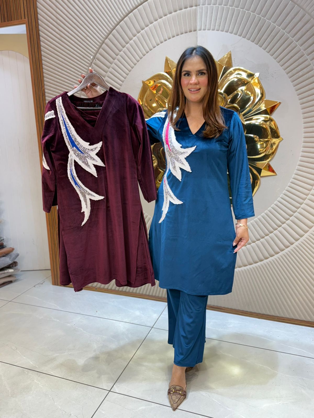 Elevate your ethnic wardrobe with this exquisite co-ord set featuring intricate sequin embellishments. The perfectly matched top and bottom combination offers versatile styling for festive occasions, celebrations, and special events. Crafted with attention to detail, the sequence work adds a luxurious shimmer and dimension to your ensemble. This sophisticated piece seamlessly transitions from daytime gatherings to evening affairs, making it an essential addition to your collection. Ideal for those who appreciate refined craftsmanship and contemporary ethnic fashion.