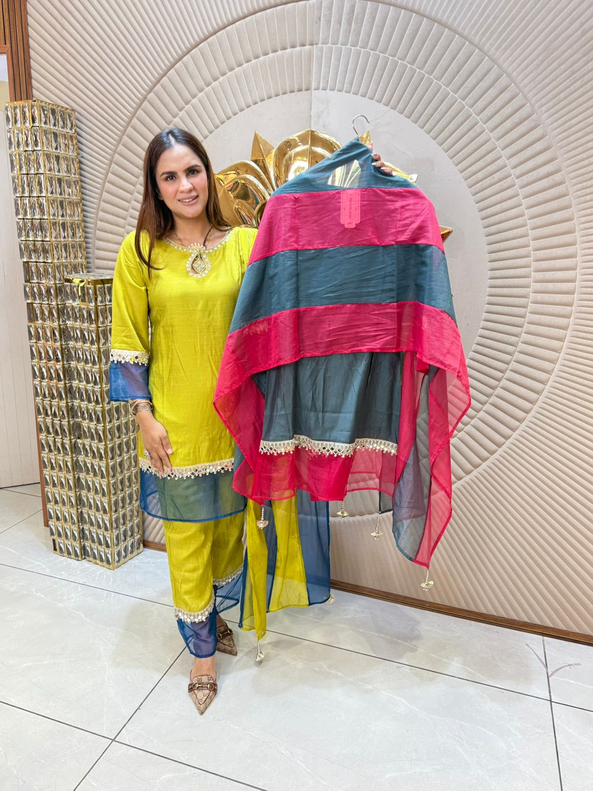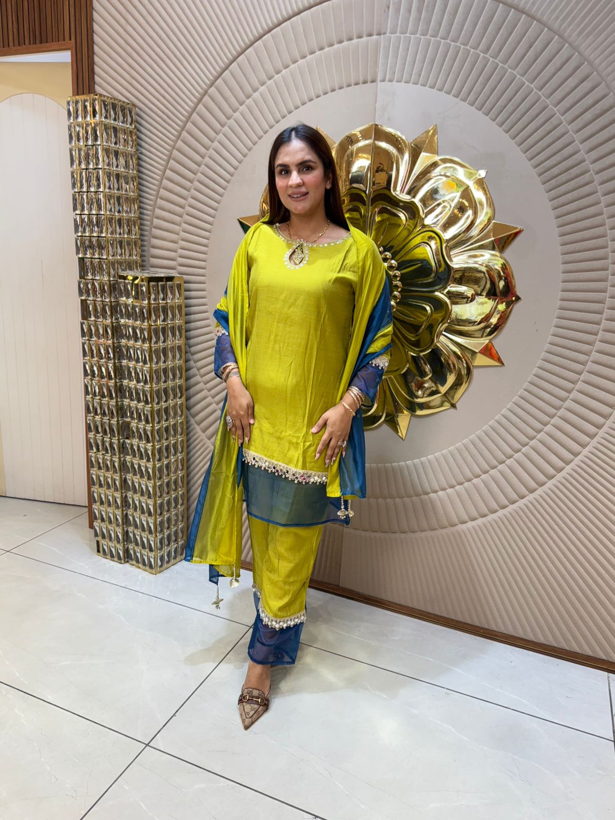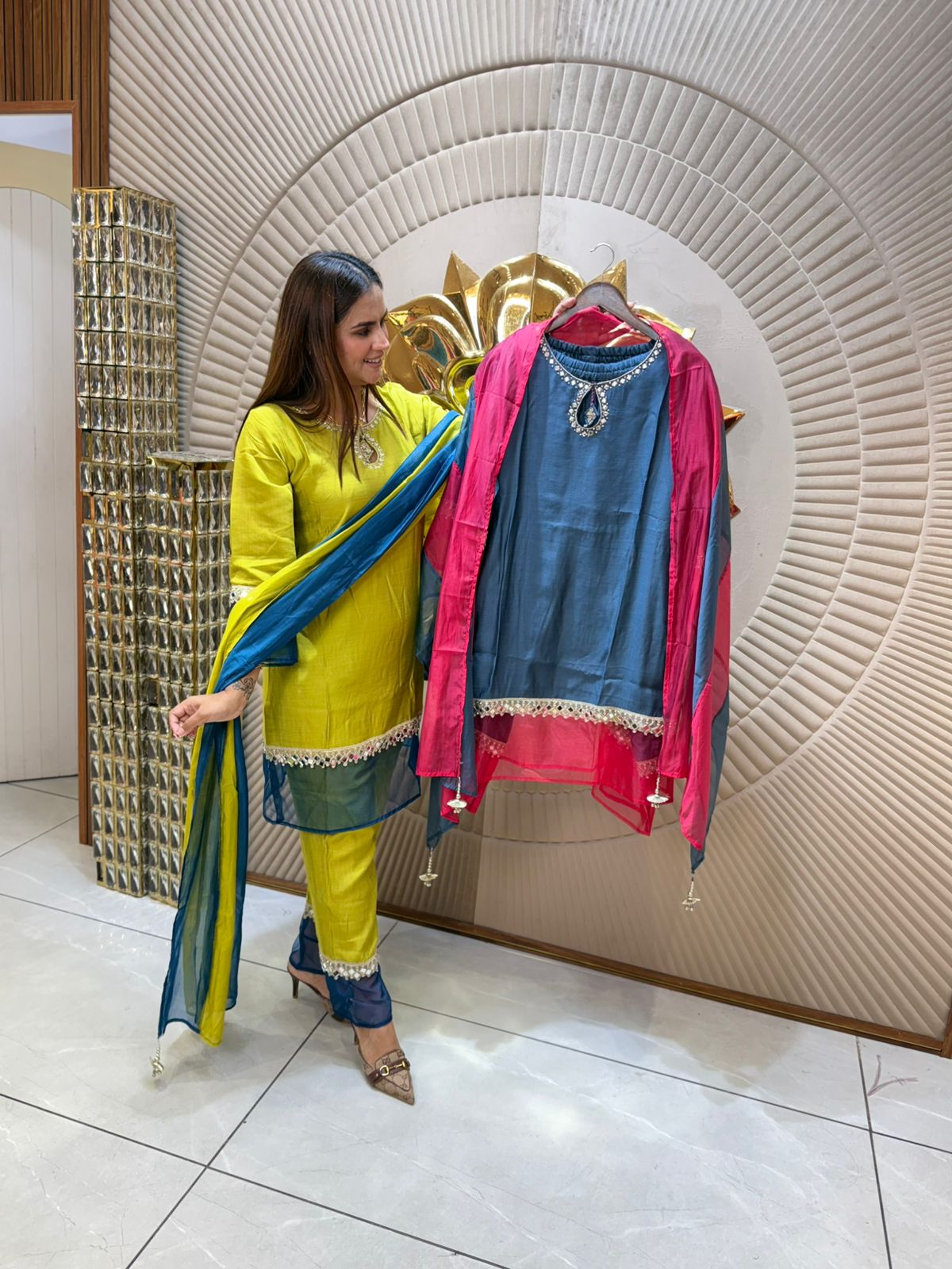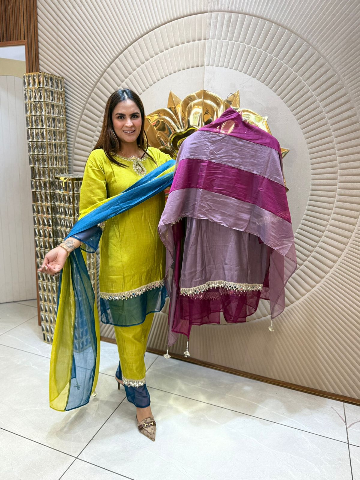 Elevate your wardrobe with this Stunning Double Color Suit featuring exquisite mirror lace work. The harmonious blend of two colors enhances its elegance, while the delicate mirror embellishments add intricate detailing, reflecting light beautifully. Crafted for those who appreciate fine craftsmanship and distinctive style, this suit promises a refined look suitable for festive occasions or sophisticated gatherings.