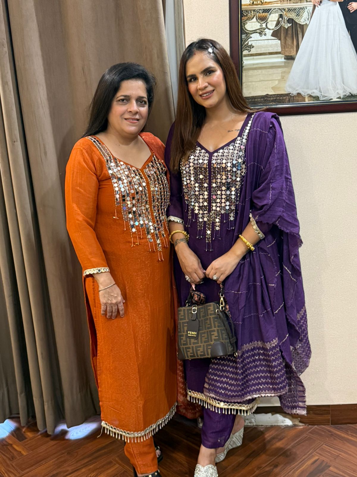 This elegant suit, featuring intricate mirror work, adds a reflective charm to your ensemble. Carefully crafted to blend traditional artistry with contemporary style, it enhances your presence at any occasion. The detailed embellishments catch the light beautifully, offering a sophisticated and eye-catching look while maintaining comfort and quality. Perfect for celebrations or formal events, this suit exemplifies expert craftsmanship and timeless appeal.